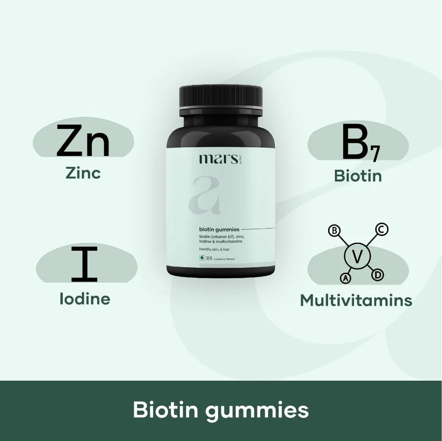 - The biotin gummies are fortified with biotin, multivitamins, zinc, and iodine, promoting healthy hair development by making hair thicker and may lessen hair loss.Â