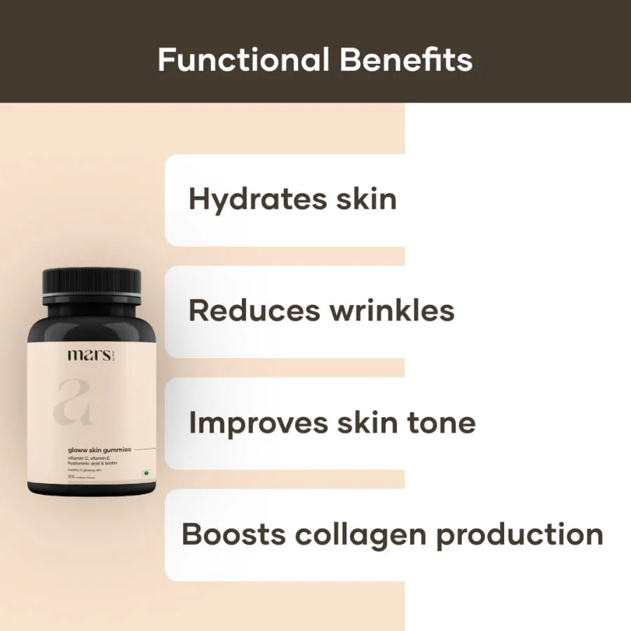 - Vitamin C: The vitamin C content of gloww skin gummies helps improve skin tone & delays skin aging. Another benefit of this powerful antioxidant is that it reverses cell damage caused by free radicals.